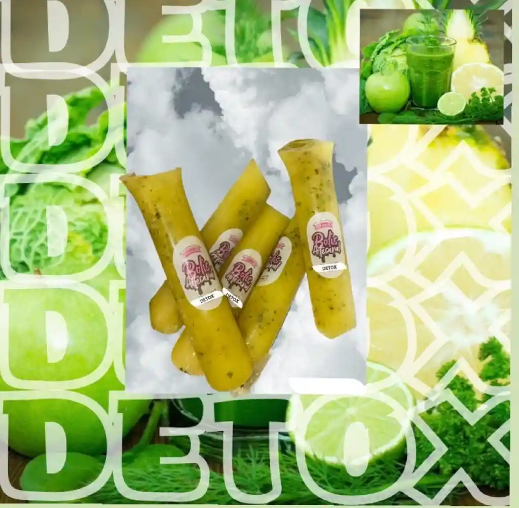Postre en forma de bolis, sabor a batido verde detox. ideal para endulzar tu dia en compañia de tus familiares o amigos.