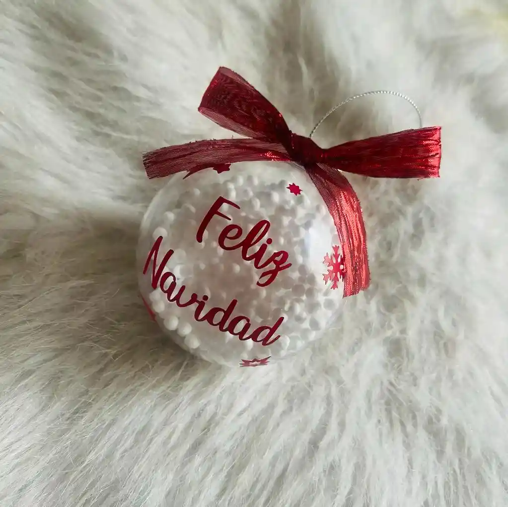 Bolita de navidad transparente rellena de nieve con "Feliz Navidad"