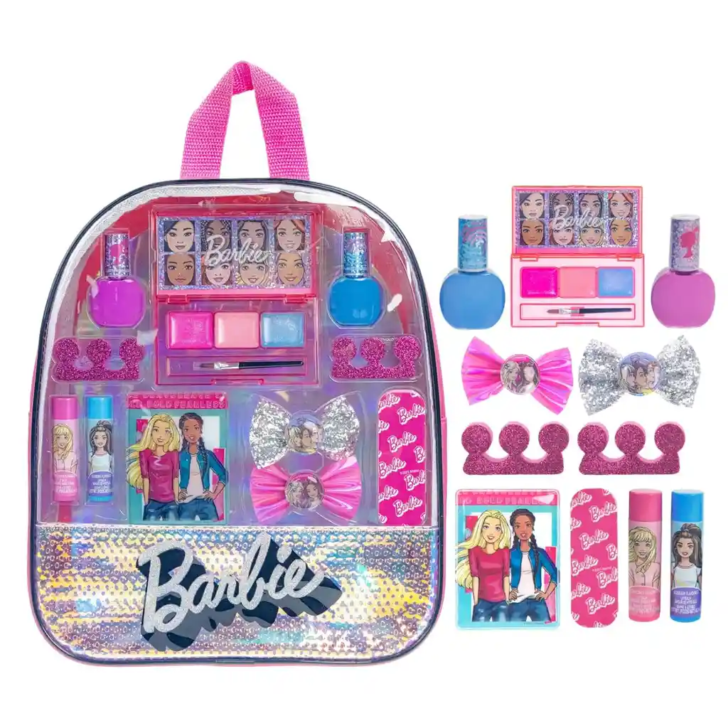 El juego de cosméticos de mochila incluye 3 brillos de labios compactos con pincel en color rosa, azul y morado con sabor a chicle. 2 lazos para el cabello brillantes con icono de Barbie hinchado. 2 esmaltes de uñas en color morado y azul con aroma a chicle. 2 bálsamos labiales en azul con sabor a arándanos y rosa con sabor a algodón de azúcar. 2 separadores de dedos de forma redonda. 1 hoja de piedras preciosas. 1 lima de uñas Barbie. 1 espejo Barbie hinchado. Todo incluido en mochila de satín. Fórmulas no tóxicas y a base de agua hacen que nuestros brillos de labios, bálsamo labial y esmalte de uñas sean seguros para niñas de 3 años en adelante. Lavable con agua.