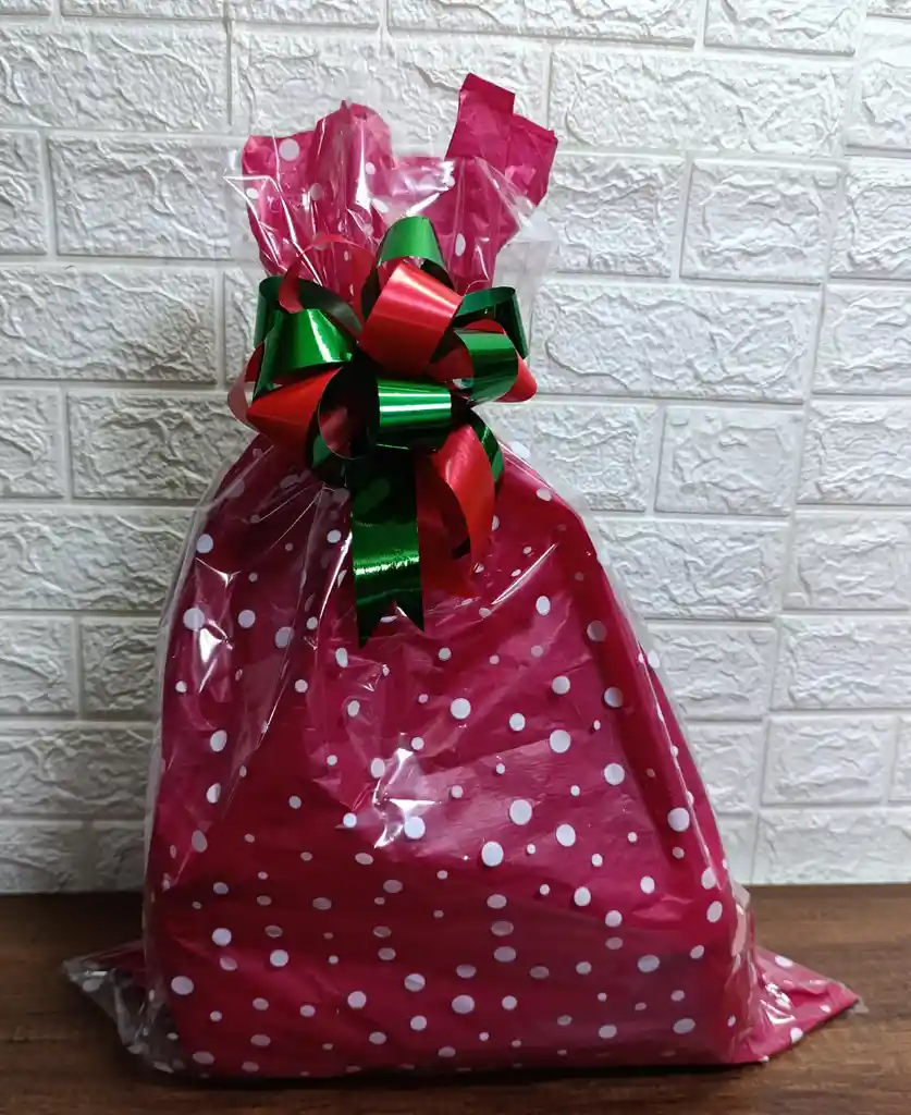 bolsa para regalo en celofán con moño y papel de ceda grande