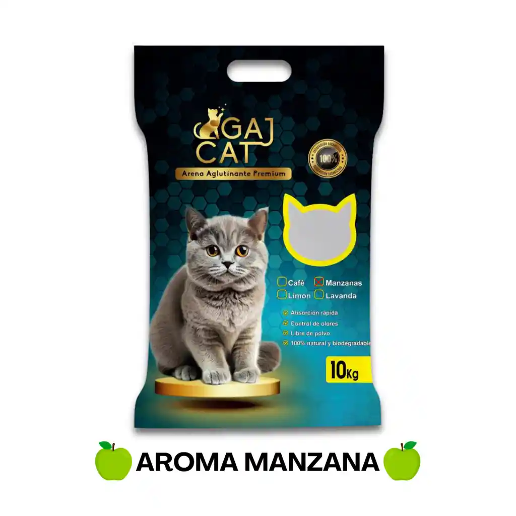 Bolsa de arena GAJ CAT (10 kg totales) AROMA MANZANA -Producto 100% natural y biodegradable. -Compuesto de bentonita. -Rápida absorción y aglutinante. -Control de olores. -Libre de polvos y químicos.
