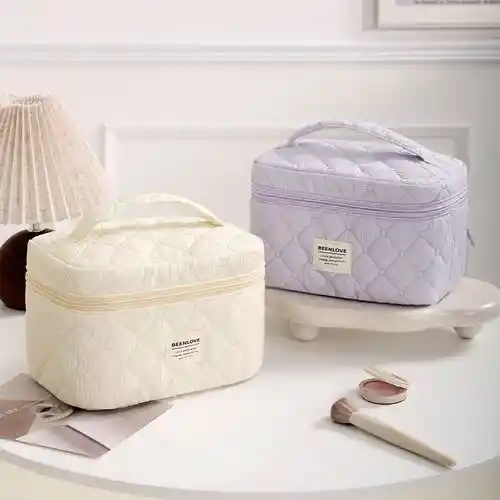 Esta cosmetiquera acolchada es el complemento ideal para organizar y transportar productos de belleza y cuidado personal con total comodidad. Su diseño elegante y minimalista cuenta con una textura acolchada en patrón de rombos, brindando un acabado sofisticado y moderno. Gracias a su estructura espaciosa, permite guardar desde maquillaje hasta artículos de higiene, manteniéndolos protegidos y ordenados en todo momento. El compartimento principal con cierre de cremallera ofrece un acceso seguro y práctico, mientras que su asa superior facilita el transporte sin esfuerzo. Su interior está diseñado para optimizar el espacio, proporcionando una organización eficiente para diferentes productos. Perfecta para el hogar, viajes o el uso diario, esta cosmetiquera combina funcionalidad y estilo en un solo accesorio. Medidas 25X17x14 cm Colores disponibles Beige, rosado, verde y morado