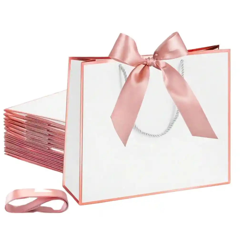 🎀Esta elegante bolsa de regalo presenta un diseño delicado y femenino, ideal para ocasiones especiales como cumpleaños, aniversarios o celebraciones románticas. Está confeccionada en cartón blanco con bordes rosados y decorada con un lazo grande de cinta satinada rosa en la parte superior, que añade un toque sofisticado. Las asas son de cuerda blanca, resistentes y cómodas para transportar. 📐 Dimensiones del producto: Alto: 15 cm / 5.91 in Ancho: 19 cm / 7.48 in Profundidad: 7 cm / 2.76 in La bolsa está colocada sobre una superficie de mármol, lo que resalta su presentación limpia y moderna. Su tamaño mediano la hace perfecta para envolver perfumes, accesorios, cosméticos o pequeños obsequios.