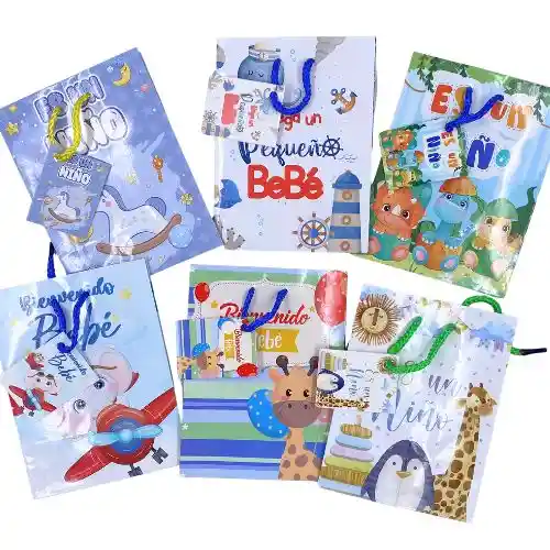 Diseñada especialmente para regalos infantiles, cuenta con estampados adorables ideales para bebé niño, perfectos para celebraciones como baby shower, nacimiento, bautizo o primera visita al recién nacido. Gracias a su acabado plastificado brillante, ofrece mayor resistencia y una presentación más llamativa, mientras que su práctico cordón facilita el transporte y cierre del regalo. ✨ ¿Qué es? Es una bolsa de papel decorativa de tamaño pequeño, elaborada con material resistente y acabado brillante, diseñada para envolver y presentar regalos pequeños para bebé niño de forma atractiva y segura. 📏 Ficha Técnica Producto: Bolsa de Regalo para Bebé Material: Papel con acabado plastificado brillante Medidas: 16,2 x 12 cm Tamaño: Pequeña Diseño: Estampados infantiles ideales para bebé niño Asas: Cordón resistente para fácil transporte Uso: Empaque y presentación de regalos