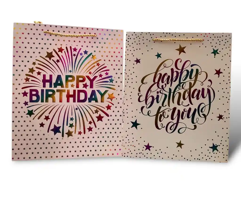 Bolsa De Regalo Cartulina Feliz Cumpleaños Fina Lisa Talla L, ALTO: 32cm ANCHO: 26cm Haz que tus regalos destaquen con la Bolsa De Regalo Cartulina Feliz Cumpleaños Fina Lisa Talla L. Esta bolsa no solo es un simple envoltorio, sino una declaración de estilo y elegancia en cada celebración. Confeccionada con cartulina de alta calidad, esta bolsa ofrece una durabilidad excepcional mientras mantiene un acabado sofisticado. Su diseño liso y minimalista es ideal para destacar cualquier obsequio, permitiendo que el contenido sea el verdadero protagonista.