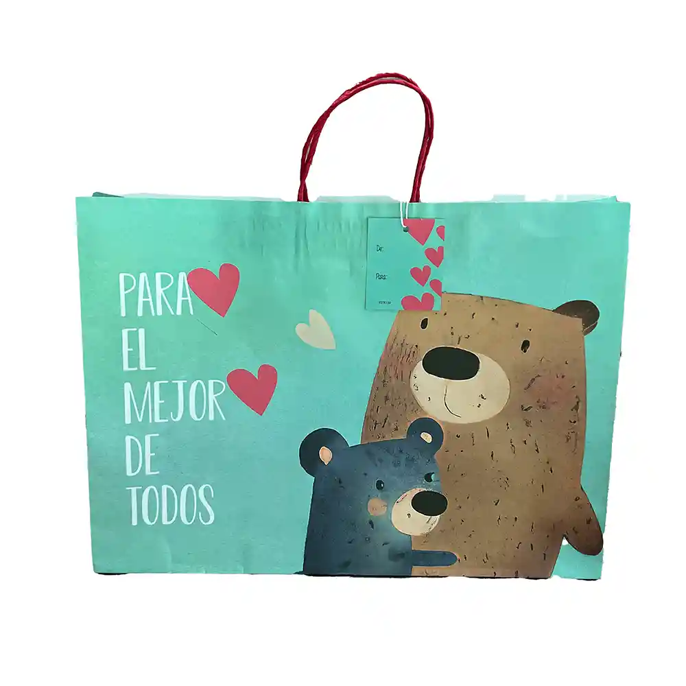 Bolsa de regalo en papel kraft con terminados especiales Medidas: 44 de ancho x 31,5 de alto x 10 fuelle cm. Trae tarjeta de para