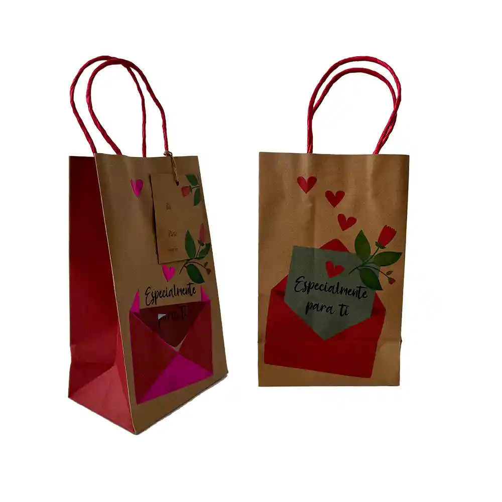 Medidas: 13 de ancho x 20,8 de alto x 8 fuelle cm Bolsa de regalo elaborada en papel kraft con acabados especiales, escarcha, mate o estampados. Contiene tarjeta de para y asas resistentes para transportar tus regalos con seguridad.