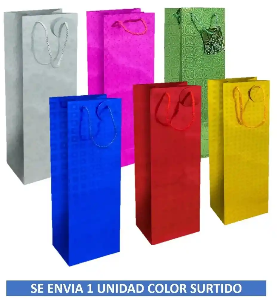 BOLSA DE REGALO METALIZADA PARA BOTELLA DE LICOR COLORES SURTIDOS. MEDIDAS: ALTO 35 CM, ANCHO 12 CM, FUELLE 10 CM