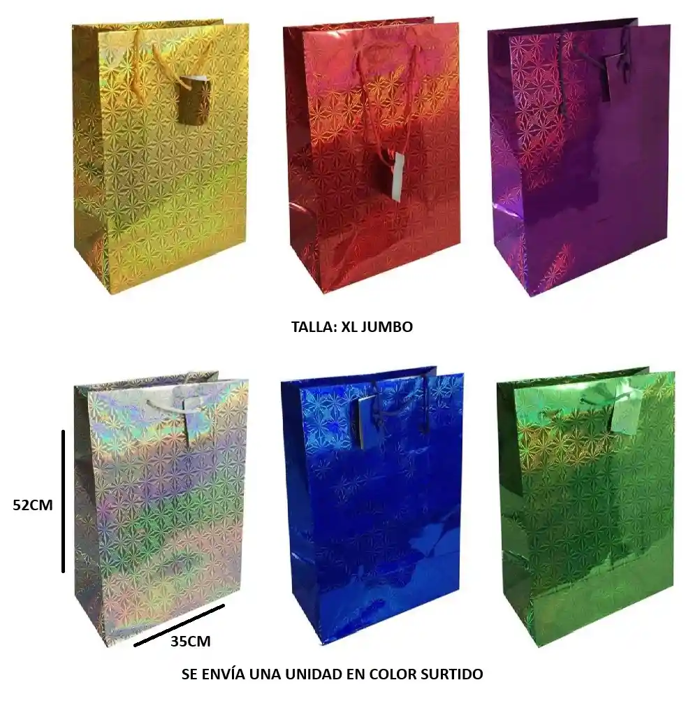 BOLSA DE REGALO METALIZADA XL JUMBO MEDIDAS, ALTO 52 CMS X ANCHO 35 CMS COLORES SURTIDOS. EL COLOR SE DESPACHA SEGUN DISPONIBILIDAD