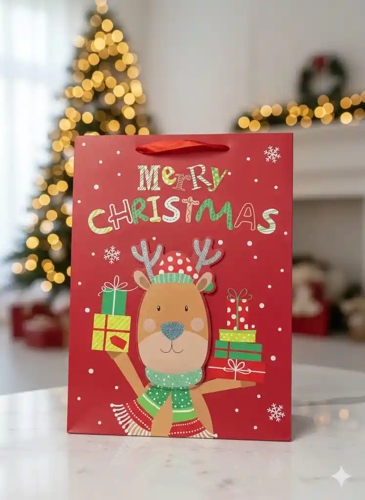 🎄 Bolsa De Regalo Navideña 32x26 cm – Mediana Diseños Coloridos y Animados de Navidad Haz que tus regalos destaquen con esta bolsa navideña mediana de 32x26 cm, elaborada en cartulina resistente y decorada con diseños coloridos y animados que transmiten alegría y espíritu festivo. Sus ilustraciones incluyen renos, Santa, árboles, regalos y patrones brillantes que llenan cada obsequio de encanto y energía navideña. 🌟 Características: ✅ Tipo: Bolsa de regalo navideña ✅ Tamaño: 32 x 26 cm aprox. (mediana) ✅ Material: Cartulina resistente ✅ Motivos: Diseños navideños coloridos y animados (se envía según disponibilidad) ✨ Renos, Santa Claus, árboles, estrellas, regalos y elementos festivos llenos de color ✅ Acabados brillantes y detalles decorativos ✅ Asas de cinta satinada, cómodas y resistentes ✅ Ideal para ropa, juguetes, perfumes, sets de belleza, libros y más ✅ Diseño alegre, llamativo y reutilizable 🎁 Uso ideal: Perfecta para intercambios, novenas, regalos familiares, escolares o cualquier detalle navideño que quieras presentar de manera divertida y vistosa. ✨ ¡Dale un toque de color y vida a tus obsequios con estas hermosas bolsas navideñas de diseños animados!