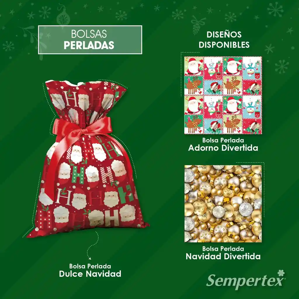 BOLSA DE REGALO NAVIDEÑA PERLADA 20X29 CM MARCA SEMPERTEX. PAQUETE X12 UNIDADES. IDEAL PARA EMPAQUE DE REGALOS NAVIDEÑOS, ACABADO PERLADO ELEGANTE Y RESISTENTE, TAMAÑO PRÁCTICO PARA DETALLES Y OBSEQUIOS. PERFECTA PARA USO PERSONAL O COMERCIAL.