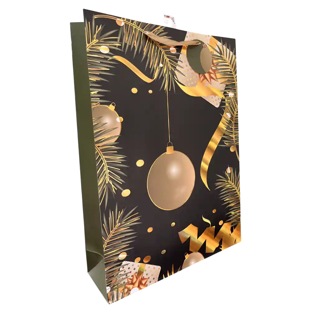 Bolsa de regalo Nico Premium con terminados especiales y tarjeta de para con diseños exclusivos para navidad. Medidas: 32 de ancho x 44 de alto x 10 fuelle cm