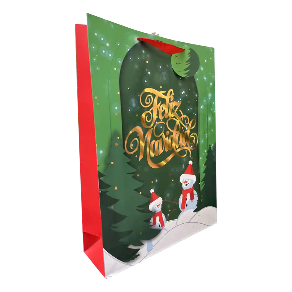 MSNU219 Bolsa de regalo Nico Premium con terminados especiales y tarjeta de para con diseños exclusivos para navidad. Medidas: 32 de ancho x 44 de alto x 10 fuelle cm