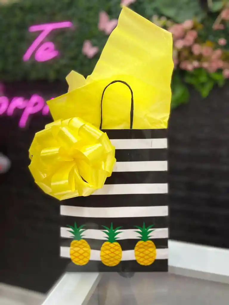 QUE TUS REGALOS SIEMPRE VAYAN CON ESTILO, UNA LINDA BOLSA DE PIÑA DE LAS SIGUIENTES MEDIDAS 26x19,5x9,5 CM, IDEAL PARA EMPACAR TUS REGALOS. INLUYE MOÑO Y PAPEL.