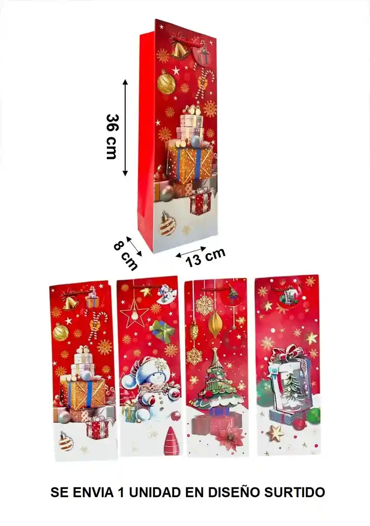 🎄 Bolsa De Regalo de motivo Navidad Para Botella De Licor. 📏 MEDIDAS: ALTO 36 CM, ANCHO 13 CM, FUELLE 10 CM. Viene en diseños surtidos. SE ENVÍA DISEÑO SEGÚN DISPONIBILIDAD