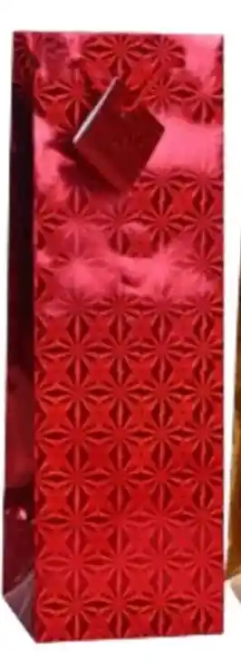 🍾 Bolsa de Regalo para Botella – Metalizada Primavera Holograma – Color Rojo Haz que tu obsequio destaque desde el primer vistazo con esta elegante bolsa de regalo metalizada en color rojo, ideal para botellas de vino, licor o bebidas especiales. Su diseño primaveral con acabado holográfico brillante la convierte en una presentación impactante y sofisticada. ✅ Especificaciones: Uso: Bolsa especial para botellas Medidas: Altura: 40 cm Ancho: 13 cm Color: Rojo metálico Diseño: Primavera con efecto holográfico multicolo Material: Papel metalizado resistente Asas tipo cordón, reforzadas para mayor seguridad 🎉 Ideal para: Regalos de vino, espumantes, licores o botellas decorativas Fiestas, cenas especiales, aniversarios, eventos empresariales Presentaciones elegantes y llamativas Una forma moderna y refinada de presentar tus botellas con estilo.