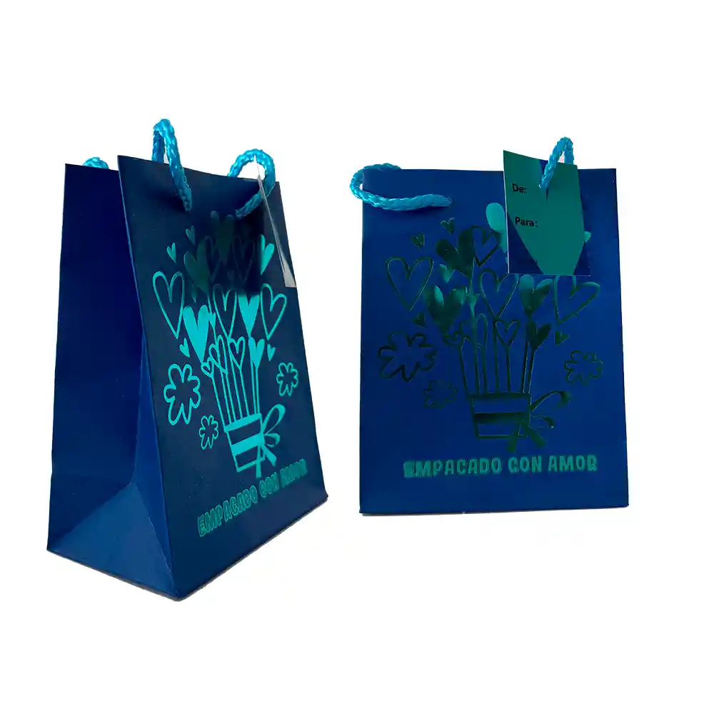 Bolsa de regalo pequeña con terminados especiales, tarjeta de para y asas en cordón de colores ACABADOS: Plastificado mate, escarchado o estampado Medidas: 11 de ancho x 14 de alto x 6 fuelle cm