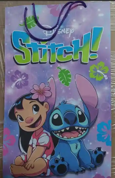 BOLSA DE REGALO mensaje stitch bolsa color lila rosa y morado animado medidas 37x22x11cm