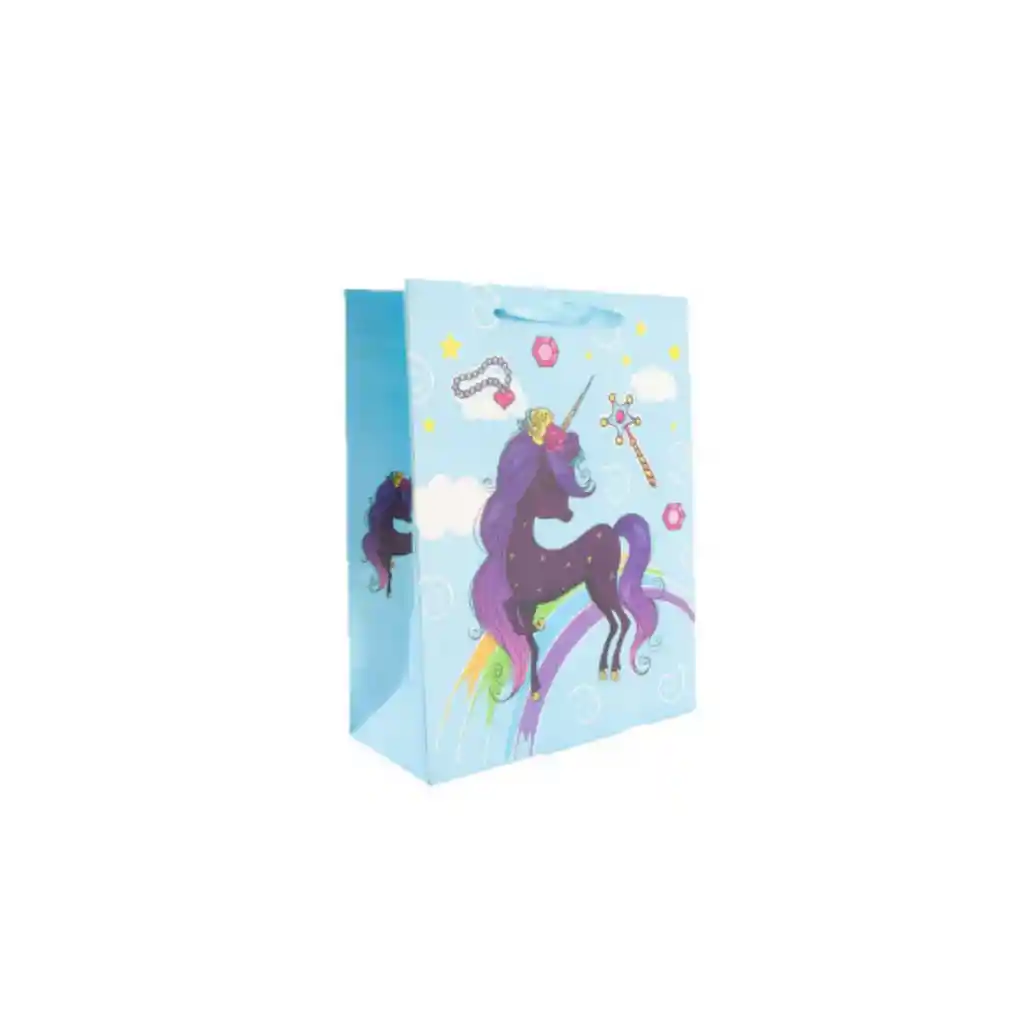 Bolsa de cartón plastificado mega para regalo con diseño de unicornio 100% reciclables. Cuenta con cinta de amarredecorativa en seda.Color: azulDimensiones: Alto: 42 cm x Largo: 30 cm x Ancho: 12 cm.Peso aproximado: 94 gr.Material: Cartón plastificado.