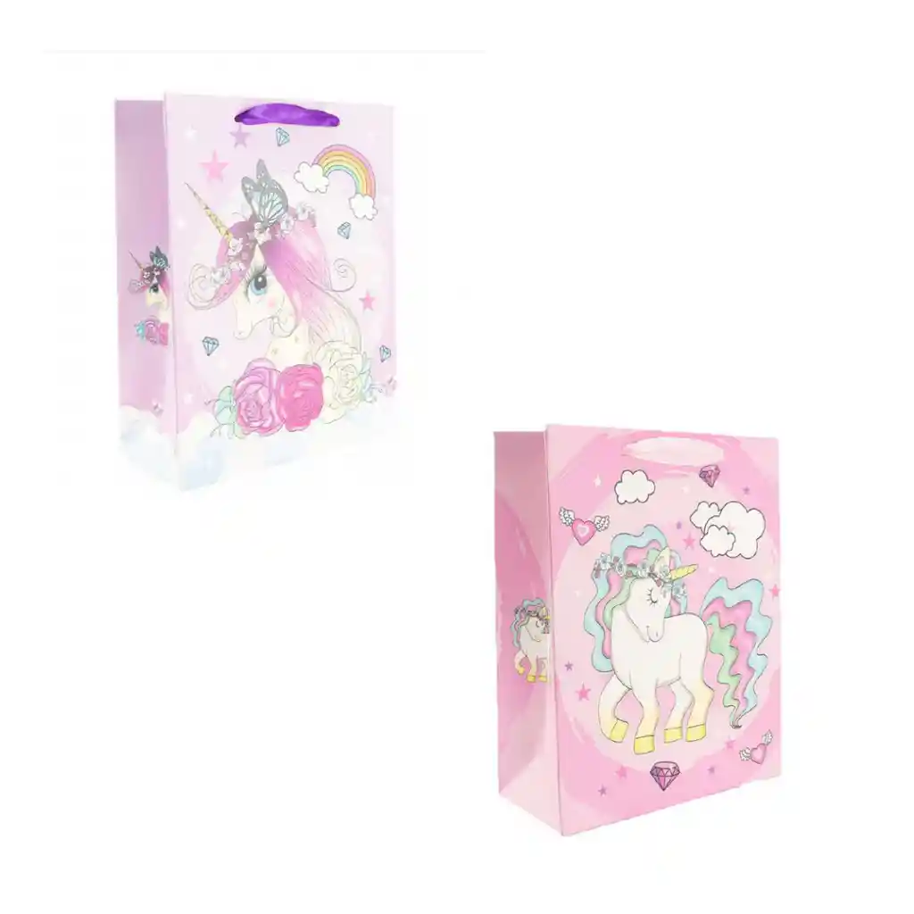 Bolsa de cartón plastificado mega para regalo con diseño de unicornio 100% reciclables. Cuenta con cinta de amarredecorativa en seda.Color: rosado Dimensiones: Alto: 42 cm x Largo: 30 cm x Ancho: 12 cm.Peso aproximado: 94 gr.Material: Cartón plastificado.