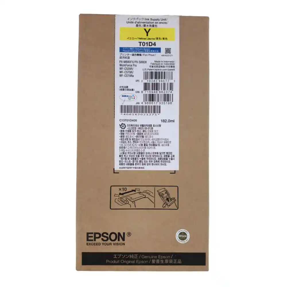 Bolsa De Tinta Epson T01D4 Amarillo (T01D4)\n\nCompatibilidad con hardware: Impresora Epson WorkForce WF-C529R, WF-C579R, WF-C579Ra\n\nRendimiento: Hasta 20000 páginas en base a un 5% de cobertura. Volumen cartucho impresión: 182 ml Colores de impresión: Magenta: Subgrupo de producto: Botella de Tinta Color: Magenta\n\nGarantía: Para información por favor visite https:epson.com.co// . Y linea 5235004 Condiciones de Garantía: Garantía de 1 año desde la fecha de compra directamente con la marca Epson. Para ello es necesario contar con la factura de compra del producto. Tecnología de impresión: Inyección térmica de tinta Código EAN: 8715946662374