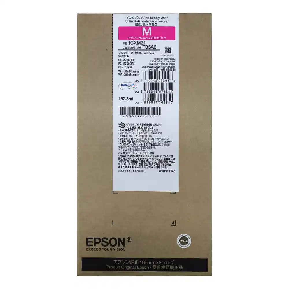 Bolsa De Tinta Epson T05A3 Magenta (T05A3)\n\nCompatibilidad con hardware: Impresora Epson WorkForce PX-M7080FX, PX-M7090FX, PX-S7090X, WF-C878R Series, WF-C879R Series\n\nRendimiento: Hasta 20000 páginas en base a un 5% de cobertura. Volumen cartucho impresión: 182, 5 ml Colores de impresión: Amarillo: Subgrupo de producto: Botella de Tinta Color: Amarillo\n\nGarantía: Para información por favor visite https:epson.com.co// . Y linea 5235007 Condiciones de Garantía: Garantía de 1 año desde la fecha de compra directamente con la marca Epson. Para ello es necesario contar con la factura de compra del producto. Tecnología de impresión: Inyección térmica de tinta Código EAN: 8715946676814
