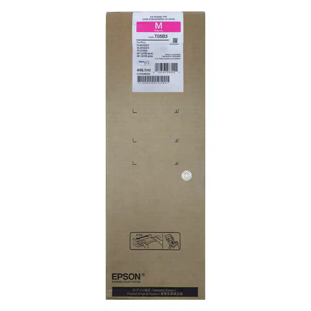 Bolsa De Tinta Epson T05B3 Magenta (T05B3)\n\nCompatibilidad con hardware: Impresora Epson WorkForce PX-M7080FX, PX-M7090FX, PX-S7090X, WF-C878R Series, WF-C879R Series\n\nRendimiento: Hasta 50000 páginas en base a un 5% de cobertura. Volumen cartucho impresión: 1 ml, 446 Colores de impresión: Amarillo: Subgrupo de producto: Botella de Tinta Color: Amarillo\n\nGarantía: Para información por favor visite https:epson.com.co// . Y linea 5235011 Condiciones de Garantía: Garantía de 1 año desde la fecha de compra directamente con la marca Epson. Para ello es necesario contar con la factura de compra del producto. Tecnología de impresión: Inyección térmica de tinta Código EAN: 10343983038