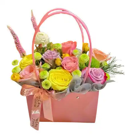 Arreglo en bolsa rígida rosa con asas, compuesto por rosas en tonos amarillo, rosado y coral, spray de rosas, pompones verdes y toques de follaje fino (según disponibilidad). Detalle alegre y moderno para cumpleaños, agradecimientos o “mejórate pronto”. Presentación premium con tul y lazo decorativo. Incluye tarjeta dedicatoria y entrega rápida el mismo día.
