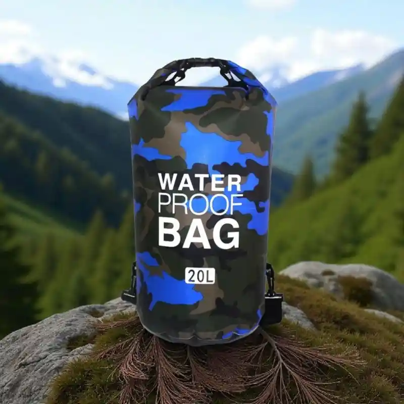 Detalles: Material: PVC Tamaño Aprox: Extendido: 58 x 50 Peso: 372 g Capacidad: 20 Litros Color: Azul Camuflado Bolso impermeable de gran capacidad resiste al agua, liviano y fuerte. Está diseñado para poder transportar de forma segura sus objetos, ya que posee un cierre de seguridad RDL. Incluye correa de transporte súper resistente, ideal para la playa, camping o cualquier actividad al aire libre. También es ideal para la práctica de deportes como el senderismo, viajes de aventura, escalada, ciclismo, vela, entre otros. Sus pertenencias se mantienen secas y protegidas simplemente enrollando la parte superior de la bolsa y sujetando con las hebillas juntas. Se puede usar tanto en agua dulce como en agua salada. Para sellar la bolsa solo es necesario doblar la bolsa dos o tres veces para un buen sellado y así evitar que el agua o la suciedad entren. Contenido del paquete: •1 Bolso Impermeable.