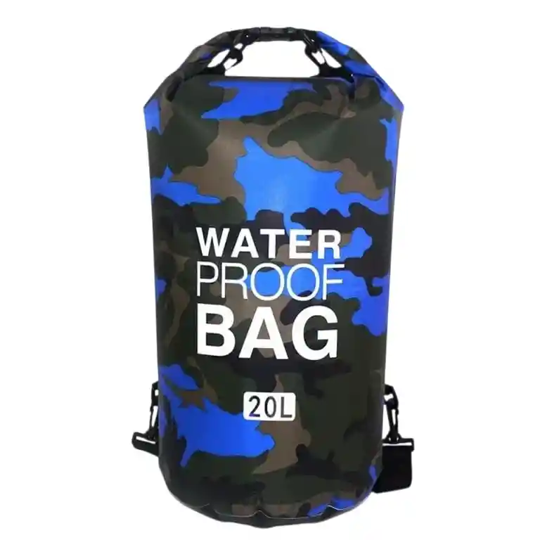 Detalles: Material: PVC Tamaño Aprox: Extendido: 58 x 50 Peso: 372 g Capacidad: 20 Litros Color: Azul Camuflado Bolso impermeable de gran capacidad resiste al agua, liviano y fuerte. Está diseñado para poder transportar de forma segura sus objetos, ya que posee un cierre de seguridad RDL. Incluye correa de transporte súper resistente, ideal para la playa, camping o cualquier actividad al aire libre. También es ideal para la práctica de deportes como el senderismo, viajes de aventura, escalada, ciclismo, vela, entre otros. Sus pertenencias se mantienen secas y protegidas simplemente enrollando la parte superior de la bolsa y sujetando con las hebillas juntas. Se puede usar tanto en agua dulce como en agua salada. Para sellar la bolsa solo es necesario doblar la bolsa dos o tres veces para un buen sellado y así evitar que el agua o la suciedad entren. Contenido del paquete: •1 Bolso Impermeable.
