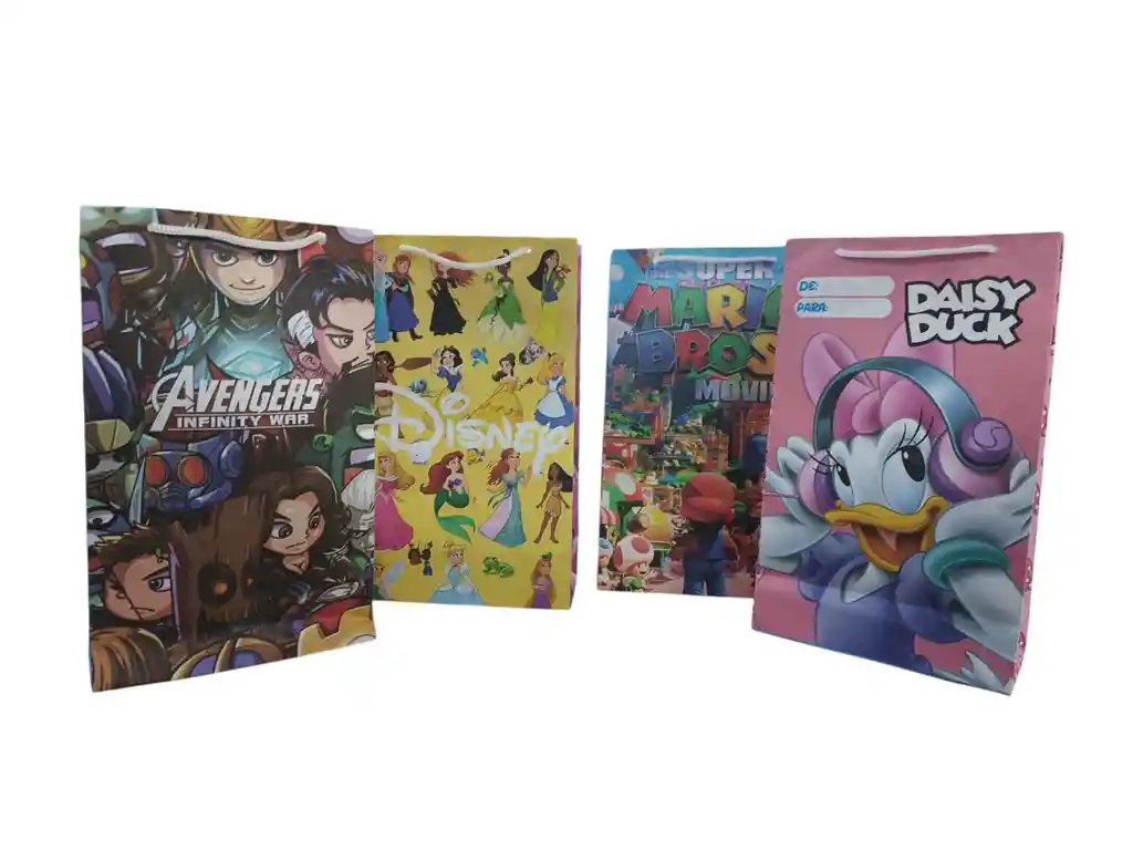 Bolsa Mediana con Personajes Infantiles – Varios Diseños Estas divertidas bolsas medianas son perfectas para regalar a los más pequeños. Con diseños coloridos y llamativos de personajes populares como Avengers, Princesas Disney, Super Mario Bros. y Daisy Duck, son ideales para cumpleaños, fiestas infantiles o cualquier ocasión especial. Fabricadas en papel resistente y con asas de cordón, combinan funcionalidad y estilo con el encanto de sus personajes favoritos.