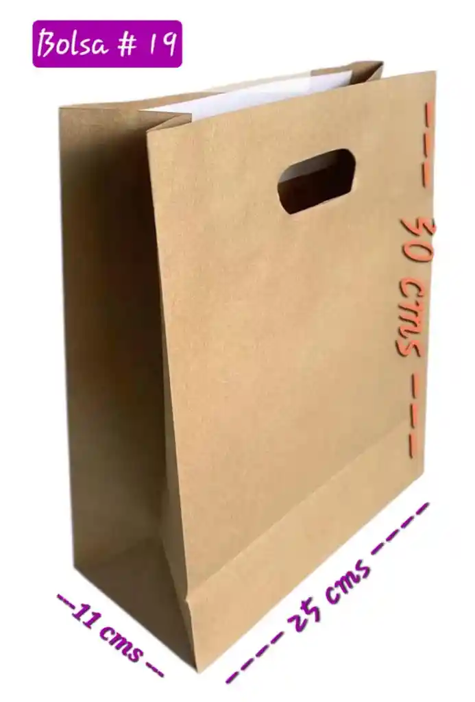 BOLSA KRAFT #19 CON MANIJA TROQUELADA REFORZADA, MATERIAL KRAFT 120 GRAMOS TIPO T-LINERS. EXCELENTE CALIDAD Y BUENA RESISTENCIA.
