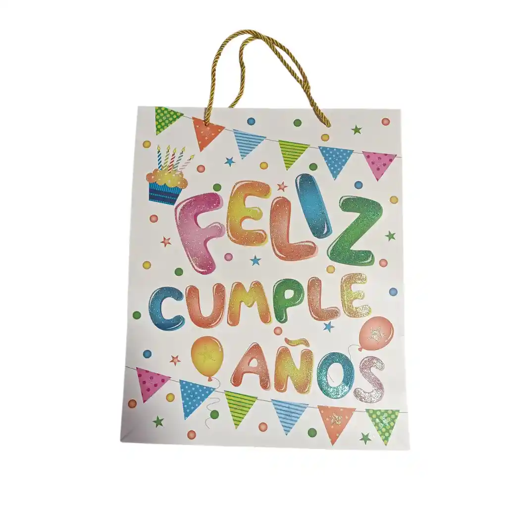 Bolsa para regalo de 26x32x10 cm " Feliz cumpleaños" blanca con letras y estampado multicolor Bolsa de cumpleaños Bolsa de regalo Cumpleaños