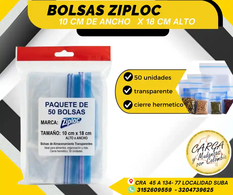 Las bolsas Ziploc son empaques versátiles con cierre hermético (tipo zipper) diseñados para preservar la frescura de alimentos, organizar objetos pequeños y transportar artículos con seguridad, evitando la entrada de aire y humedad. Son reutilizables, transparentes y resistentes, ideales para congelar, marinar o empacar snacks. Alta Calidad - Producto Garantizado. Visítanos: Cr. 45a # 134 - 77 Local Esquina Contáctanos: 315 2609 559