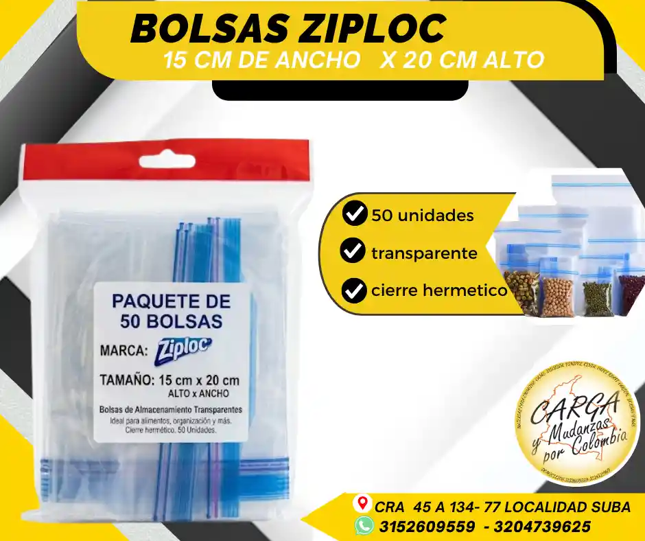Las bolsas Ziploc son empaques versátiles con cierre hermético (tipo zipper) diseñados para preservar la frescura de alimentos, organizar objetos pequeños y transportar artículos con seguridad, evitando la entrada de aire y humedad. Son reutilizables, transparentes y resistentes, ideales para congelar, marinar o empacar snacks. Alta Calidad - Producto Garantizado. Visítanos: Cr. 45a # 134 - 77 Local Esquina Contáctanos: 315 2609 559