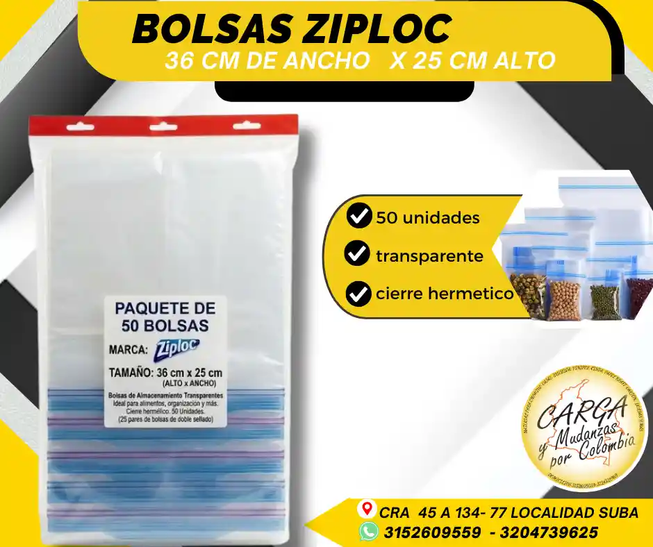Las bolsas Ziploc son empaques versátiles con cierre hermético (tipo zipper) diseñados para preservar la frescura de alimentos, organizar objetos pequeños y transportar artículos con seguridad, evitando la entrada de aire y humedad. Son reutilizables, transparentes y resistentes, ideales para congelar, marinar o empacar snacks. Alta Calidad - Producto Garantizado. Visítanos: Cr. 45a # 134 - 77 Local Esquina Contáctanos: 315 2609 559