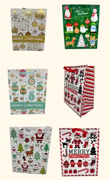 Bolsas navidad mediana plastificada. Medida 32 cm de largo x 36 cm de ancho. Manija en material de cinta en satín. Diseños surtidos