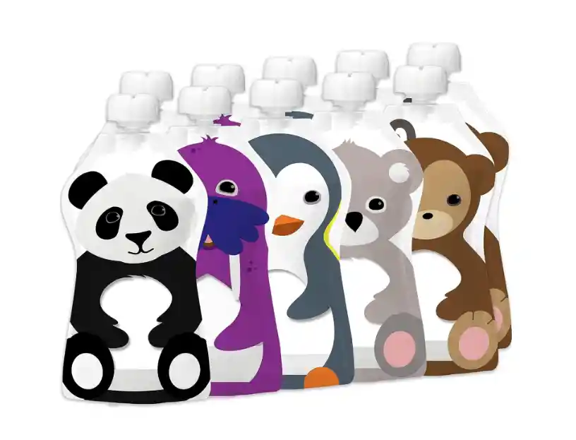 Vienen 6 Bolsas reutilizables, cada una con su tapa BOLSA DE ALIMENTOS RECARGABLABLE: Estas bolsas reutilizables para aperitivos tienen una boquilla superior y forma curvada con una amplia abertura inferior que te permite llenar fácilmente tus bolsas con tu comida favorita como puré, yogur, batido, salsa de manzana o granizado congelado afrutado usando una cuchara o vierte directamente en la bolsa. No se necesitan embudos ni accesorios. Diseño cuidadoso: el tamaño y la forma perfectos de nuestra bolsa de puré de manzana fue cuidadosamente diseñada para todas las edades y necesidades. La curvatura redondeada suave es ideal para que las manos pequeñas se sujeten y aprieten cómodamente. Nuestros coloridos diseños de animales inspiran su imaginación Seguro y fácil de limpiar: nuestras bolsas reutilizables son aptas para congelador; puedes almacenar y servir desde el mismo recipiente. Nuestras bolsas de alimentos también son aptas para lavavajillas. Una amplia cremallera permite un fácil acceso a la limpieza con agua. Sin esquinas ni grietas para que la comida se atasque.