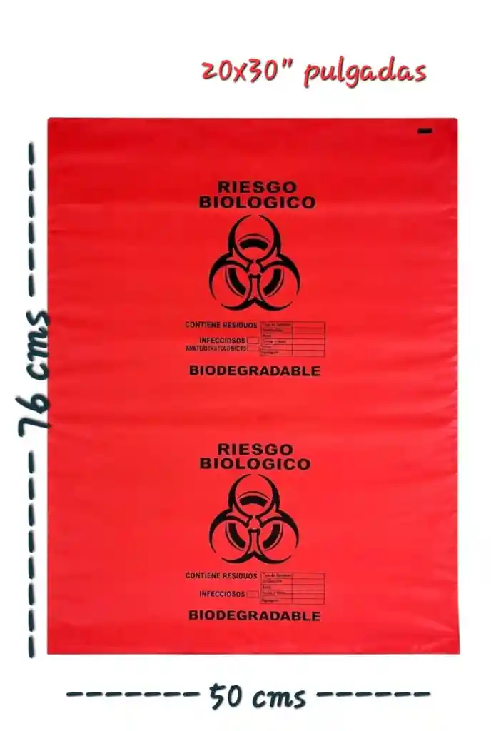 BOLSA PARA BASURA ROJA RIESGO BIOLOGICO PAQ X 50 UNDS IMPRESA CALIBRE 1.4 50 cms de ancho x 76 cms de largo