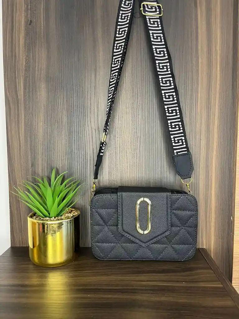 Hermoso bolso negro manos libres, con detalles rectangulares, doble compartimiento y muy versátil