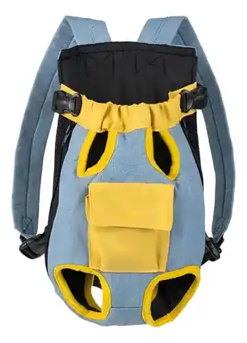 mochila transportadora de mascotas, específicamente un modelo frontal ajustable para perros y gatos pequeños. Diseñada para llevar a la mascota cómodamente mientras se mantienen las manos libres. Cuenta con correas ajustables y paneles traseros acolchados para la comodidad del usuario. Tiene aberturas para las patas y la cola, y un bolsillo frontal para guardar artículos pequeños. El material es poliéster.
