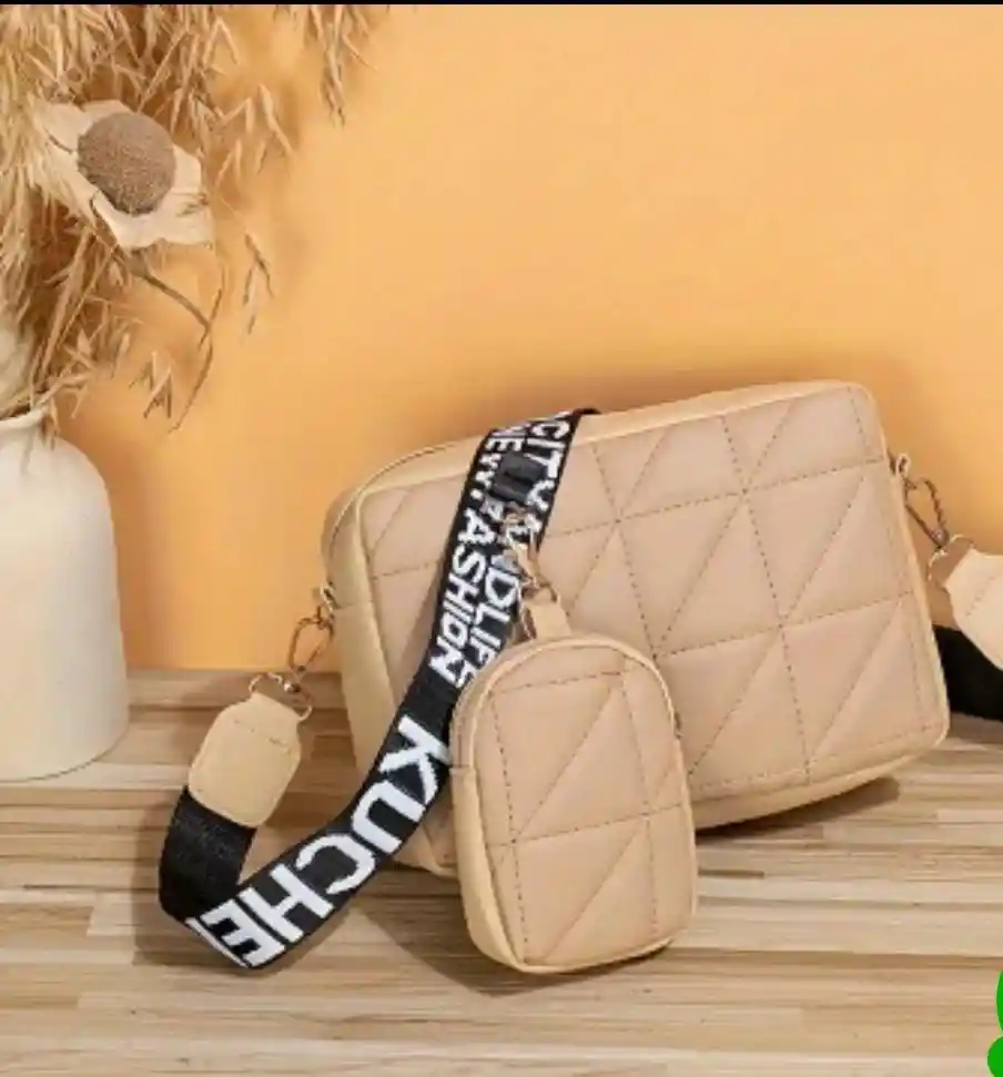 olso beige con diseño acolchado geométrico, moderno y funcional. Incluye un práctico monedero a juego y correa ancha estampada en blanco y negro para un estilo urbano y casual. Cómodo y ligero para llevar lo esencial.