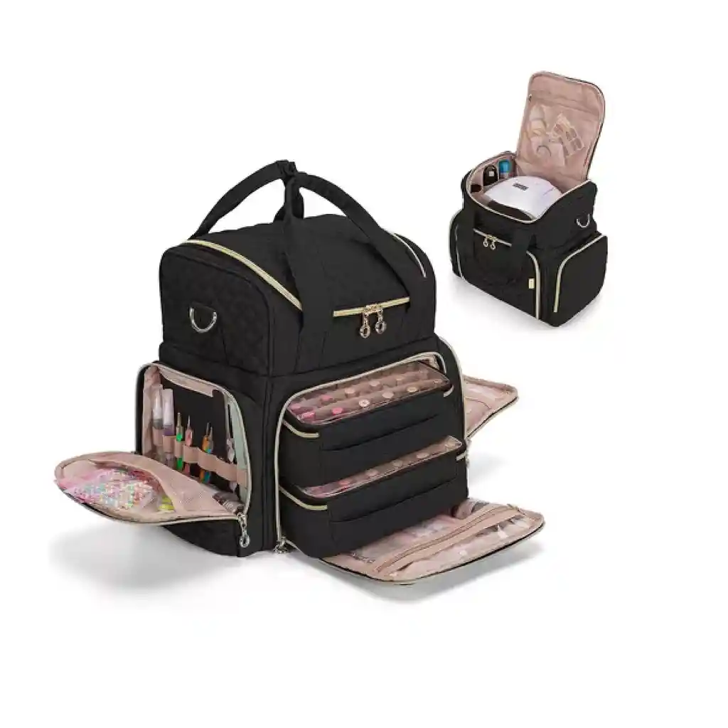 No es solo un organizador de esmalte de uñas, sino también un almacenamiento de bolsas de cosméticos. Las ranuras son extraíbles y, sin ellas, los estuches para uñas vacíos son perfectos para guardar muchos cosméticos. Hecho de material de calidad y forro de microfibra suave. La cremallera es pesada y resistente. 【Capacidad extra grande】 Tiene capacidad para hasta 80 botellas. Tamaño de la bolsa completa: 16" x 12" x 16". 3 estuches para uñas extraíbles (uno grande, 2 estándar), el más grande: 12,5" x 9" x 3,5". los otros dos tamaños: W9"XD6.5"XH3.5". El espacio superior tiene un bolsillo de malla y bandas elásticas. Es espacioso para secadores de uñas, proveedores de uñas, accesorios para uñas, quitauñas, lámparas de uñas y otras herramientas. 【Diferentes materiales de ranuras brindan flexibilidad en la organización】Compatible con la mayoría de las botellas de esmalte de uñas, incluido OPI. El almacenamiento de esmalte de uñas viene con 2 estuches para uñas extraíbles que tienen ranuras de diferentes materiales y bolsillos transparentes con cremallera. Uno es de moho, el otro es de terciopelo suave, lo que proporciona flexibilidad de organización. Cada ranura es perfecta para 24 botellas (15 ml/0,5 fl. o) como mínimo. En la ranura de terciopelo caben 48 botellas de esmalte de uñas de 7 ml. 【Bolsillos multifuncionales】2 bolsillos laterales con cremallera+un bolsillo frontal con cremallera+un bolsillo trasero grande para iPad/computadora. 2 bolsillos laterales con cremallera con bolsas de malla incorporadas y bandas elásticas para guardar cepillos para pulir, herramientas de manicura, herramientas de punteado y otros proveedores y accesorios de uñas. 【Estuche para esmalte de uñas para llevar】El estuche de transporte para esmalte de uñas viene con un asa de transporte y una correa para el hombro desmontable con una almohadilla. La correa de la espalda está unida a la maleta. Lleva tu esmalte de uñas y proveedores a donde quieras ir.