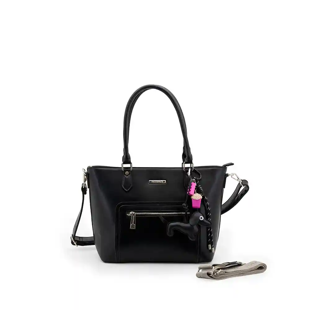 Bolso de mano con cierre frontal y Charm decorativo, Cuenta con doble asa de mano y correa ajustable y removible para usarlo también como bandolera y con bolsillo trasero con cremallera, elaborado en sintetico con forro interno en tela, bolsillo monedero y herrajes metalicos plateados,Garantía de 3 meses directamente con el vendedor en cierres, herrajes y costuras,