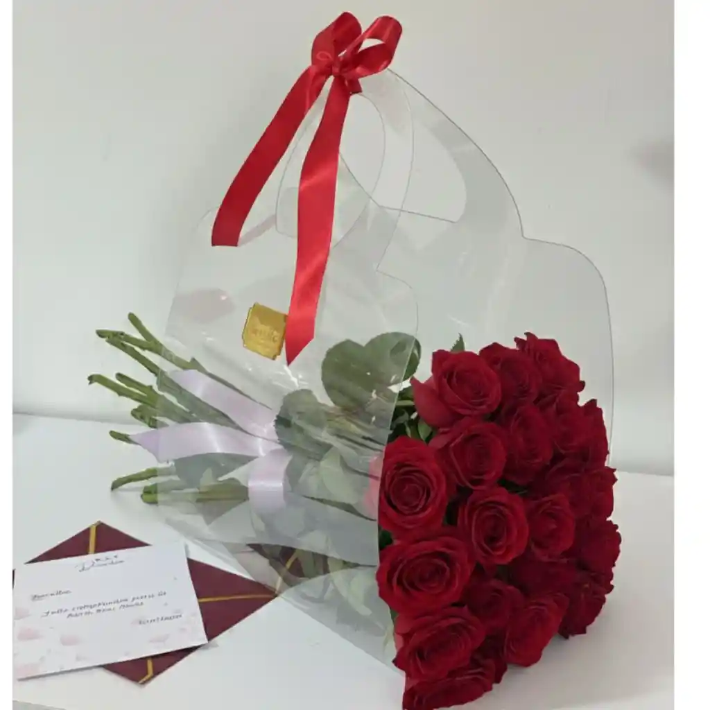 Presentación exclusiva en empaque rígido transparente tipo bolso con 24 rosas rojas naturales de exportación, lazo de seda rojo, lazo decorativo de marca y tarjeta personalizada de dia de la mujer