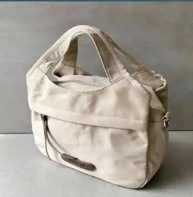 Es un bolso de tamaño mediano con un cuerpo de textura suave y acabado ligeramente satinado. Mantiene una estructura flexible que permite que se adapte a su contenido sin perder su forma general. En la parte superior tiene dos asas cortas, acolchadas y unidas de manera continua al cuerpo del bolso, lo que le da un aspecto compacto y práctico. En la zona frontal se encuentra un bolsillo externo de corte recto, adornado con un lazo delgado que cae desde el centro. Justo debajo hay una pequeña placa con el nombre de la marca grabado. La abertura principal lleva una cremallera parcialmente visible y ligeramente hundida entre los pliegues superiores del bolso. A uno de los lados se engancha una correa desmontable y ajustable, ancha y resistente, con letras impresas que repiten el nombre de la marca. Los herrajes metálicos, como el mosquetón y los anillos de sujeción, añaden un toque funcional y robusto al diseño. En conjunto, transmite estilo urbano, versatilidad y comodidad para el uso diario.