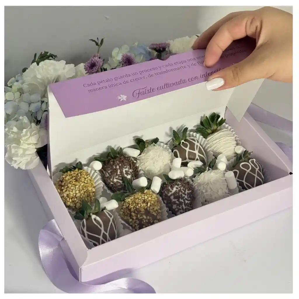 Bolso decorativo con flores en tonos pastel acompañado de deliciosas fresas con chocolate y tarjeta especial.