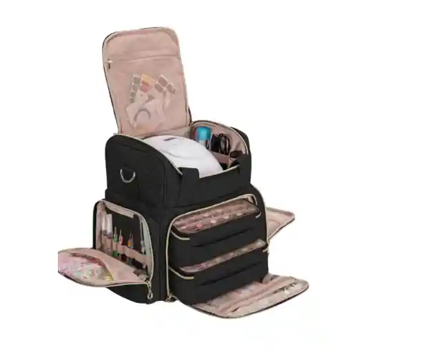 Bolso Grande Organizador Esmaltes Y Herramientas Uñas Hecho de microfibra de poliéster suave, el forro interior suave y grueso proporciona una buena protección para la botella de esmalte de uñas y múltiples accesorios de decoración de uñas. Completo con asas resistentes y una correa de hombro desmontable. La Correa vertical en la parte posterior se desliza sobre el asa de una maleta. El compartimento inferior contiene 2 cajas desmontables. Cada caja contiene hasta 24 botellas de 15ml (0,5 floz) de esmalte de uñas. Los divisores de botellas en la caja son flexibles y extraíbles. La parte superior tiene un divisor extraíble para colocar el espacio de almacenamiento para un secador de uñas de tamaño regular (tamaño aproximado 9*7,5*4,5 pulgadas) y otras herramientas de arte de uñas. 2 bolsillos laterales proporcionan un amplio espacio para brochas de manicura y otras herramientas de manicura" Bolso Organizador Capacidad: 40 esmaltes de uñas, almacenamiento de cosméticos Capacidad: puede acomodar 48 botellas de gel de uñas, almacenamiento de cosméticos Correa de hombro 2 cajas desmontables Material: Tela poliester