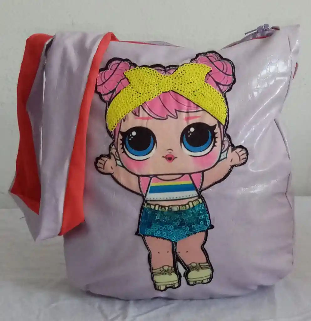 Elaborado en tela plástica y forro rojo diseños de muñecas L.O.L.