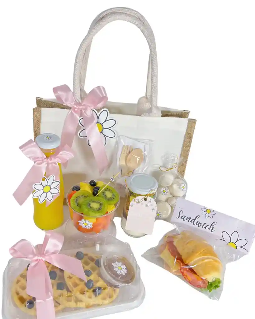 Bolso en yute reutilizable,Jugo de naranja 103% natural,Ensalada fresca de frutas,Parfait,Porción de merenguitos dulces,Sándwich gourmet,lechuga y chorizo vela,Waffles dorados,arándanos,fresa,Porción de miel,Cubiertos incluidos,tarjeta con dedicatoria.